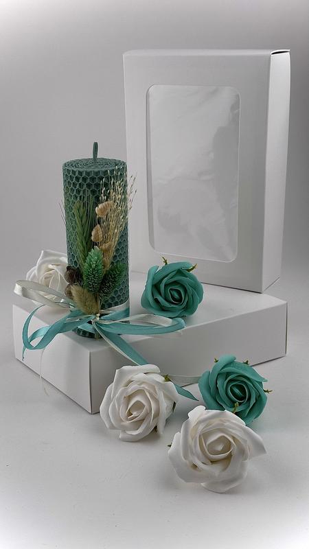 Вражайте з нашим елегантним подарунковим набором! У подарунковий набір входить: - свічка ручної роботи з медової вощини висотою 13 см і діаметром 4,5 см. Свічка декорована сухоцвітами. - мильні троянди у кількості 5 штук, що вражають своєю красою. Цей набір - ідеальний спосіб зробити особливий момент ще прекраснішим.