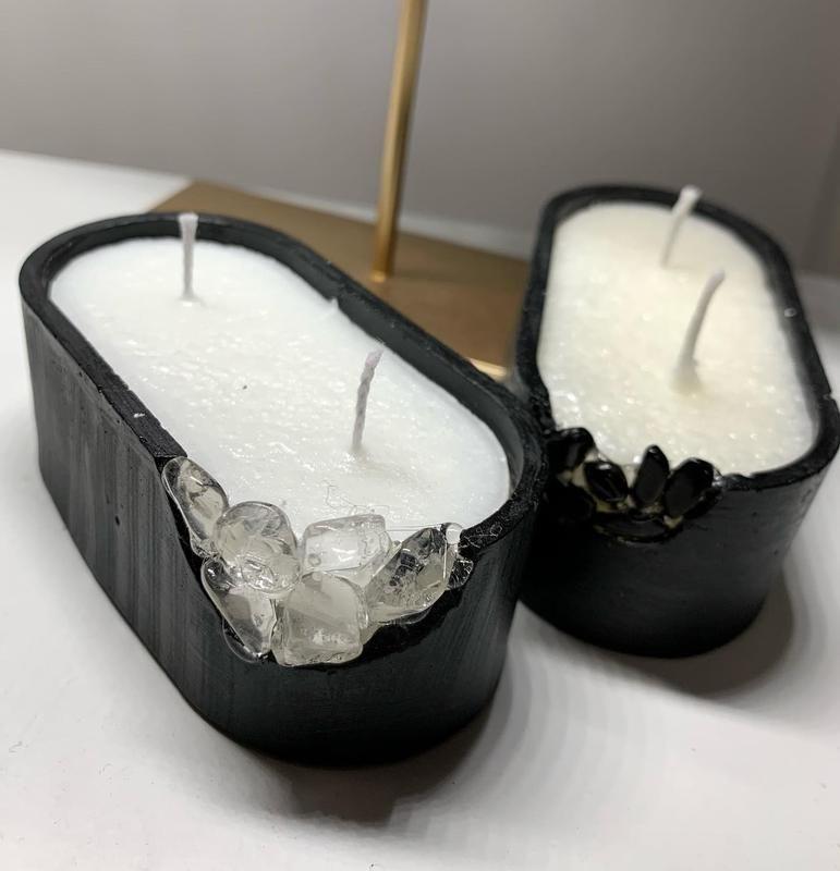 Не потрібно шукати щастя, потрібно бути його джерелом. Надіюсь ці свічки стануть вашим джерелом щастя. Вони виконані в овальній бетонній формі з двома бавовняними гнітами, а родзинкою виступає благородний чорний обсидіан і прозорий кришталь. ▫️9,5*5*3 см ▪️під замовлення можливі різні кольори ▫️ціна 150 грн Аромати: ваніль, сандал, плід страсті, Lancôme, цитрусова буря, Gucci by Gucci, Versace Товар виготовляється на замовлення