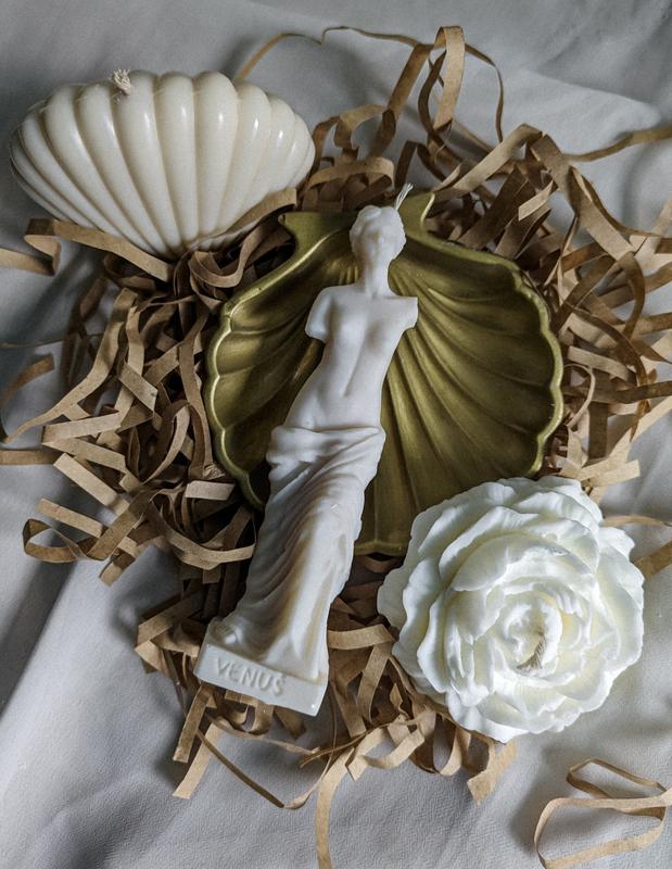 Подарунковий набір свічок з соєвого воску "Народження Венери". До набору входить: - Свічка Венера 1 шт(15 см,50грам) - Свічка Півонія 1 шт (8 см, 60 грам) - Свічка Мушля 1 шт (8.5х7 см, 140 грам) - Декоративна гіпсова підставка "Золота Мушля" 1 шт(10 см) Термін виготовлення 1-3 дні