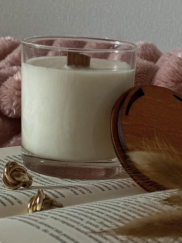 Свеча (200 грамм) из 100% натурального соевого воска, с древесным глотом, ароматизированная ( аромат можно выбрать на выбор) Соевый воск проявляется абсолютно безопасным и при горении не выделяет вредных веществ.