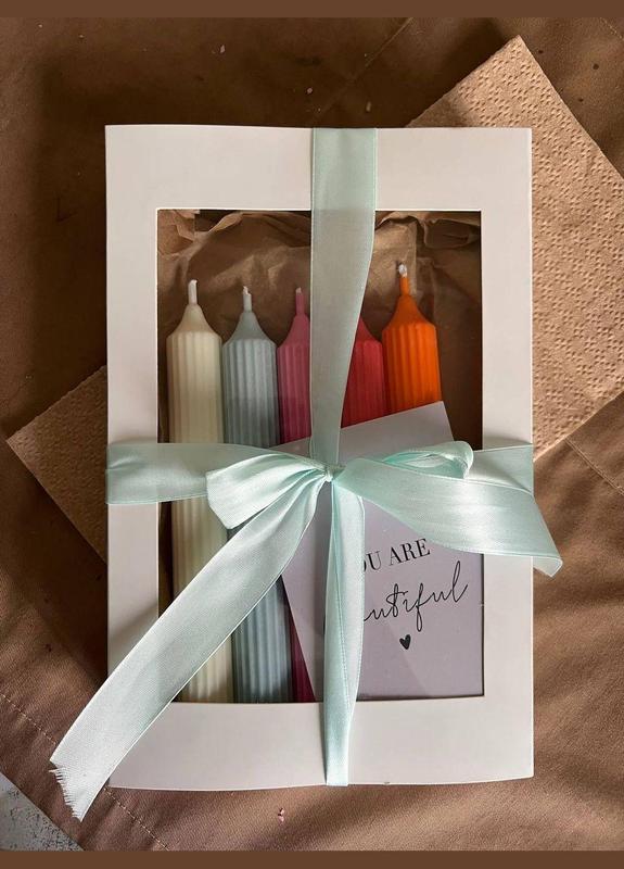 Комплект из 5-ти столовых соевых свечей и открыток. Упаковка- подарочная Материал: экологичный соевый воск, хлопковый фитиль. Вес 1 свечи: 90 гр Диаметр 2.5 высота 18 см * Срок изготовления может длиться до 2-х рабочих дней.
