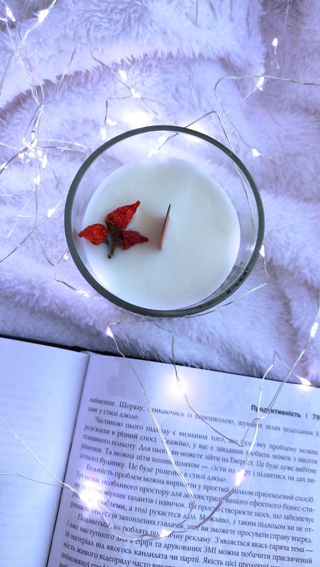 Свічка з червоним перцем в склянці. Свічка з кокосового воску з дерев'яним гнітом з червоним перцем в склянці. Свічка має незабутній ніжний аромат " Грошової енергії". Ретельно підібраний склад олій, таких як ефірна олія лимону, апельсину, пачулі, дозволяє направити всю енергію і сили на досягнення максимальних результатів вашої діяльності, привести до багатства і успіху, розкрити потенціал та здібності, зняти всі страхи і переживання. Аромат легко усуває втому, підвищує працездатність і позитивне мислення. Пригнічує депресію і поганий настрій. Свічка це символ тепла, затишку, світла і свята. Частіше даруйте рідним символ тепла і затишку. Частіше запалюйте свічки в будинку - це очищує простір і створює затишок. Кожна свічка йде в подарунковій упаковці. Вартість свічки 400 грн