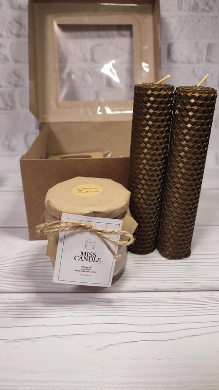 До набору входить: Свічка вагою 200 грам із соєвого воску ароматична Аррмат на вибір: Бананово-горіховий хліб,квітково-фруктовий, аромат,цитрусовий,пряний. Дві свічки із бджолиного воску (вощини)