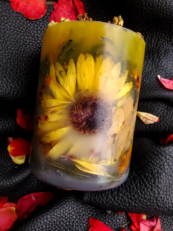 Ботанічна свічка виготовлена з гідролізованого парафіну, що застосовується в харчовій промисловості та є безпечним для здоров’я оточуючих. Кожна свічка унікальна, адже виконана вручну. Вона складається із внутрішньої частини, яка прогорає вглиб(тонельно), не зачіпаючи зовнішні стінки із сухоцвітами. Завдяки цьому створюється ефект нічника – сухоцвіти м'яко підсвічуються, забезпечуючи затишне освітлення. Після прогорання внутрішньої свічки,зовнішня конструкція зберігає форму і може використовуватися як підсвічник. Вага-671 гр. Діаметр-9 см. Висота-12 см. Орієнтовний час горіння - 65 год.