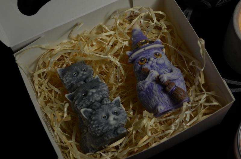 Подарунковий набір свічок ручної роботи з соєвого воску котик-чаклун та три котики, подару...