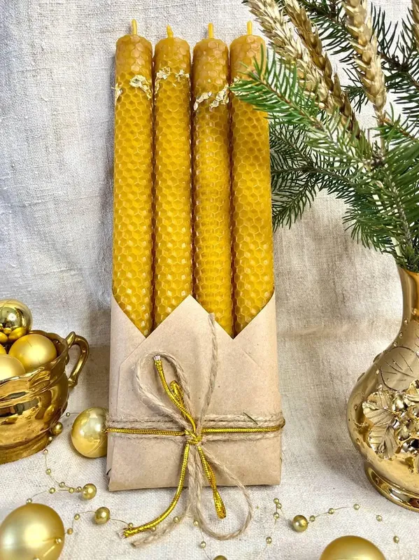 Новорічний подарунковий набір свічок із вощиною ручної роботи. Цей витончений набір свічок — ідеальний подарунок для тих, хто цінує натуральну красу й атмосферу затишку. У наборі три свічки, кожна з яких виготовлена вручну з натуральної медової вочини. Висота кожної свічки становить 26 см, а діаметр — 2 см, що робить їх ідеальними для створення м'якого освітлення в будь-якому інтер'єрі. Свічки з вочини не тільки додають тепло та затишок у новорічні святкові моменти, але й мають корисні властивості, адже під час горіння вони не виділяють шкідливих речовин. Ці свічки стануть чудовим доповненням до святкового декору або приємним подарунком для ваших близьких. Додайте магії та тепла до свят із нашим новорічним набором свічок ручної роботи!