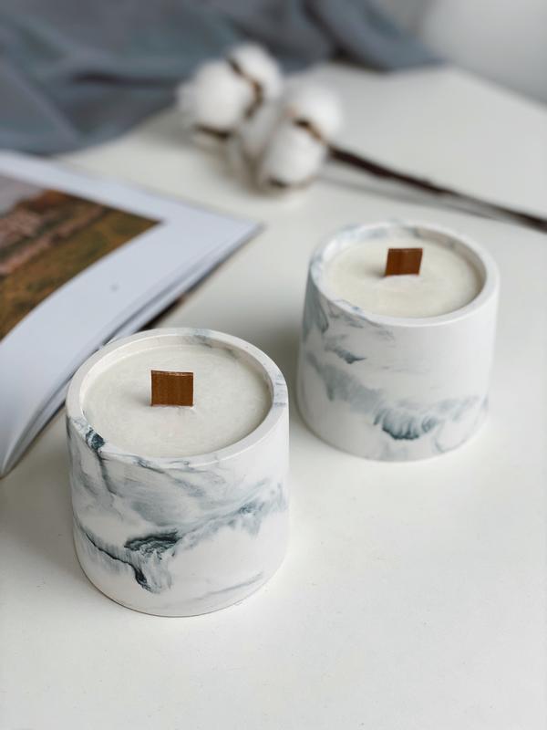 Набір ароматичних соєвих свічок в гіпсових кашпо minimal в техніці marble на підставці сit...