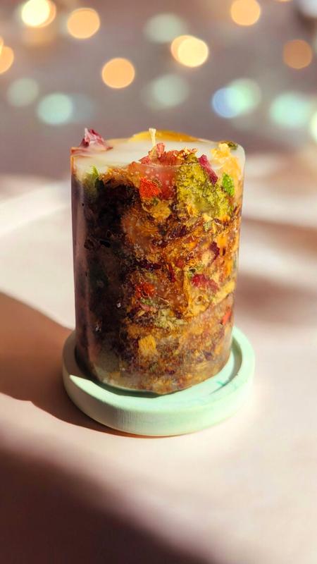 Свічка різнокольорова, із сухоцвітами - 35 годин горіння, з ароматом кориця