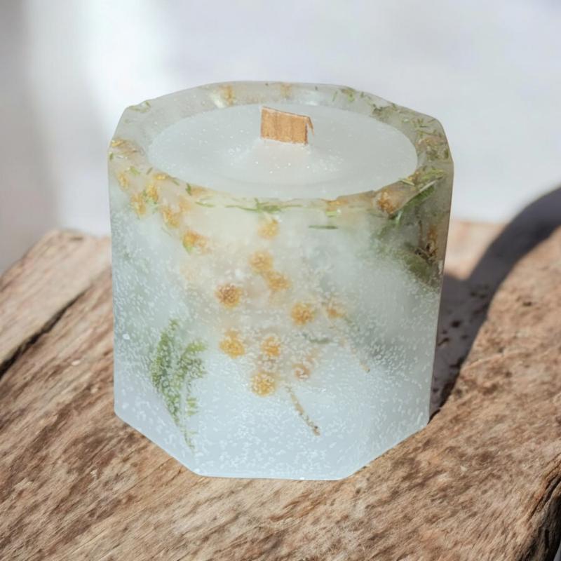 Восьмикутна свічка з мімозою та дерев'яним гнітом, с ароматом апельсин у шоколаді