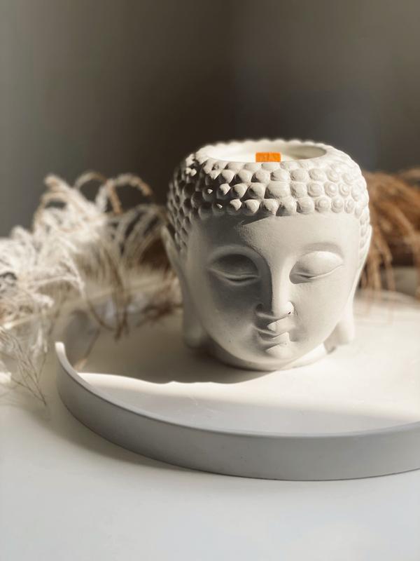 Соєва свічка з ефірними аромамаслами в гіпсовому кашпо будда 9.5х10.5см citrus&wood