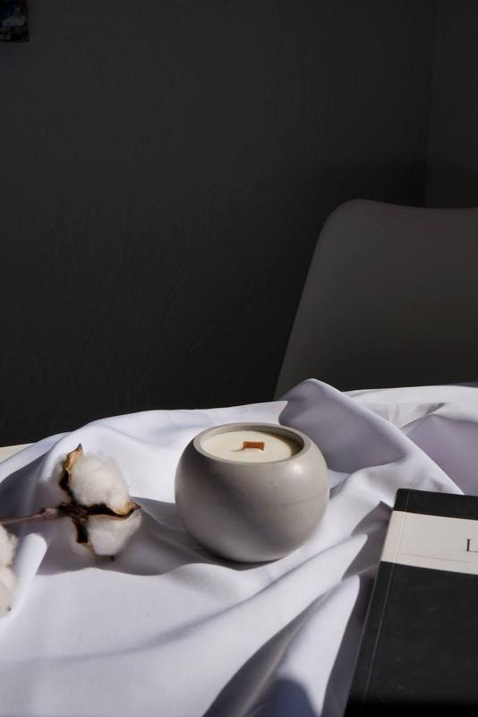 Соєва свічка з ефірними аромамаслами в гіпсовому кашпо сфера 9х6.5см cotton