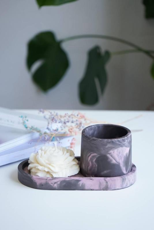 Соєва аромасвічка півонія з гіпсовим кашпо duo на підставці в техніці marble ручної роботи...