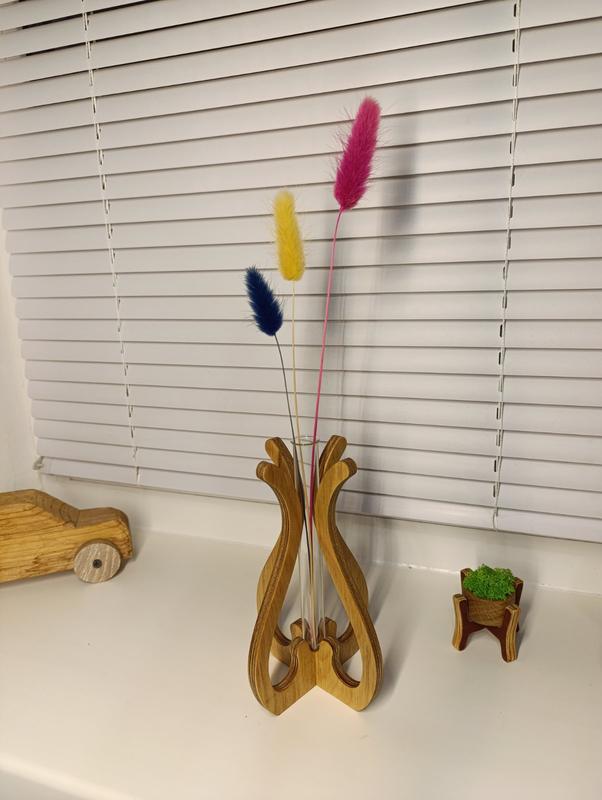 Продам вазу виготовлену з фанери 8мм, і скляна колба. Покрита мінеральною олією з воском. Розміри: Висота 170мм. Ширина 110мм.