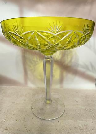 Винтажная, очень красивая вазочка-фруктовница из цветного желтого хрусталя. Имеет оригинальный вырезной узор, который придает ей элегантный вид. Может использоваться как для сервировки фруктов, так и для хранения сладостей. Несмотря на то, что предмет уже использовался, он находится в идеальном состоянии и готов к дальнейшему использованию. Высота 28 см.Диаметр чаши 24 см