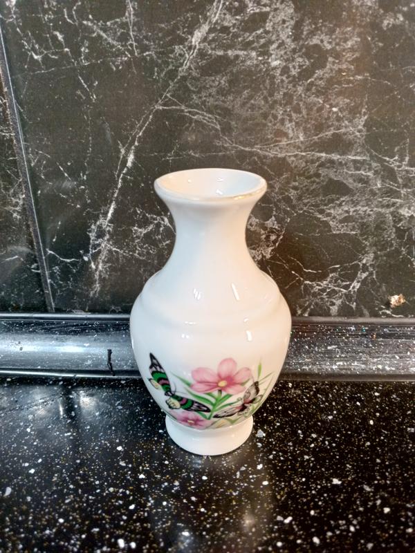 Декоративная фарфоровая ваза белого цвета с росписью в виде розовых цветов и бабочек.