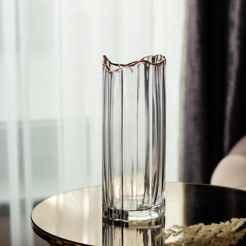 Стеклянная ваза для цветов - это изысканный элемент декора, который вносит уникальность в дизайн вашего помещения. Выполненная из стекла, она имеет высоту 29,5 см, что делает её прекрасным выбором для размещения цветочных композиций. Прозрачное стекло подчёркивает лёгкость и элегантность дизайна, а золотая окантовка добавляет вазе нотку роскоши и утончённости. Благодаря своему деликатному и изящному виду, ваза станет идеальным декоративным элементом для любого интерьера, придавая ему элегантность и стиль. Характеристики вазы для цветов Материал: стекло Высота: 29,5 см Диаметр: 10,5 см Цвет: прозрачный с золотой окантовкой Основные преимущества вазы. Подходит для широкого спектра видов цветов и сухоцветов. Ваза изготовлена из высококачественного стекла, что гарантирует прочность и долговечность. Универсальность дизайна позволяет вазе вписаться в любую обстановку.