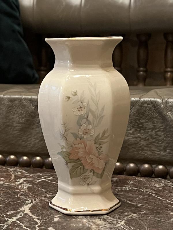 Елегантна вінтажна ваза, виготовлена в Англії. На дні маркування з короною та написом “Made in England”, що підтверджує її походження. Матеріал: порцеляна Висота: 16 см Форма: шестигранна основа, класичний вигин корпусу Декор: ніжний квітковий орнамент у пастельних тонах, золоте оздоблення по краю Ваза чудово підійде як для використання, так і для колекції чи інтер’єру у вінтажному стилі.