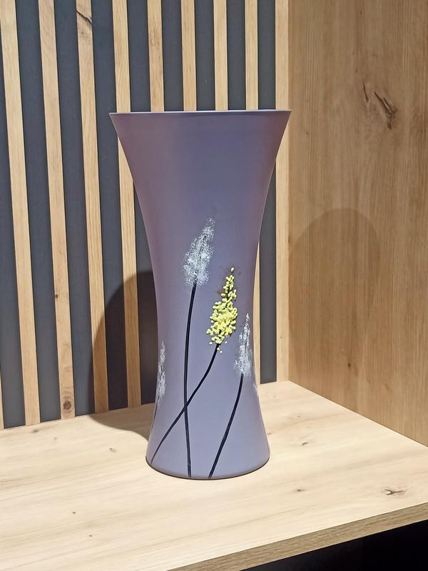 Продається красива декоративна ваза зі скла з ручним розписом. Виріб виготовлений у ніжному бузковому кольорі та прикрашений витонченим малюнком, нанесеним вручну, що робить кожну вазу унікальною. Вона стане яскравим акцентом в інтер'єрі та підкреслить витончений смак власника. Характеристики: Стан: чудове, без відколів і тріщин Матеріал: скло Оздоблення: ручний розпис Колір: бузковий Висота: 33 см Діаметр дна: 12 см Діаметр уздовж крайки: 16,5 см Ваза ідеально підійде для букетів живих або штучних кольорів, а також може використовуватися як самостійний елемент декору. Чудовий варіант для прикрашання вітальні, спальні або в подарунок цінувальникам оригінальних виробів ручної роботи.