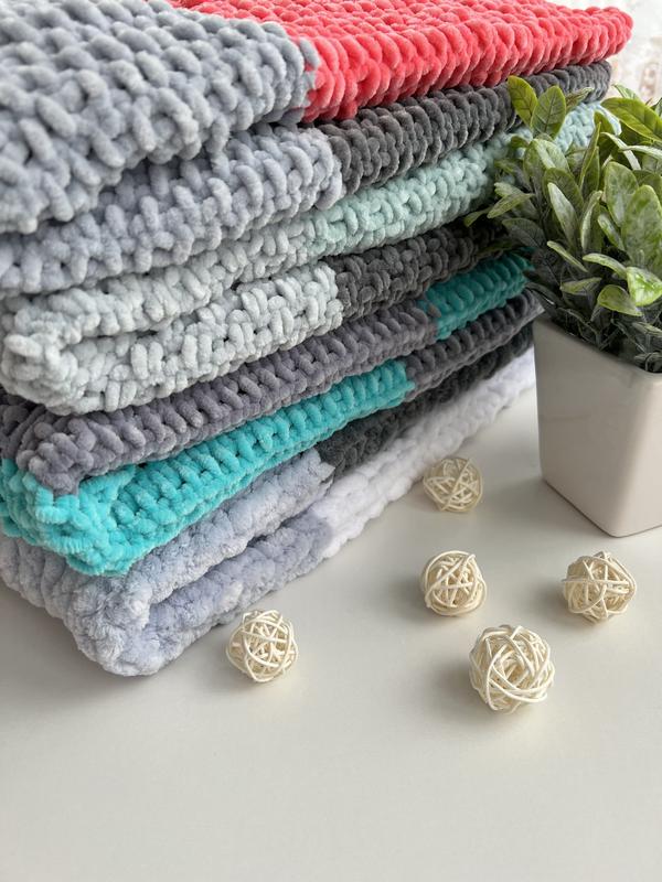 В наличии яркие плюшевые пледы для деток. Очень теплые и мякоти. Приятные на ощупь. В берущиеся спицами из гипоаллергенной пряжи, которая не будет вызывать аллергии у Вашего малыша.