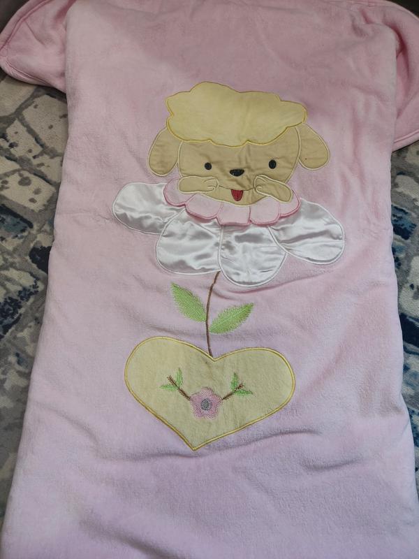 Можна користуватись як покривальцем або як чохлом на ніжки в санки або коляску.На замочку і на кнопках внизу.Гарний рожевий колір,не облізлий.Фото якості не передає.