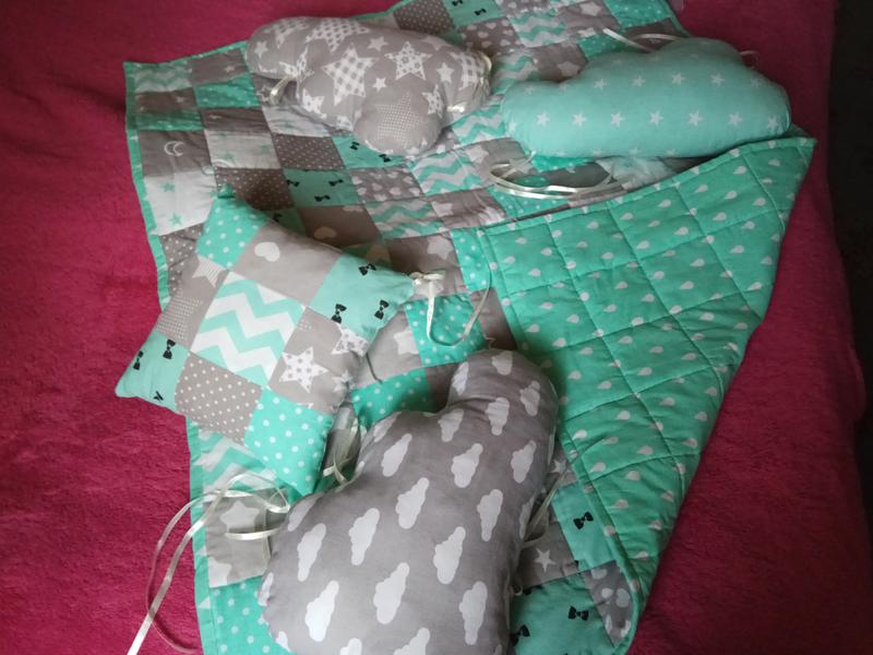 Нові плед і подушечки для дитячого ліжечка. Робили під замовлення. Не використовувалися. Плед двосторонній, щільний, великий. Подушечки на стрічках. Три у формі хмаринки, одна - квадратна. Не обов'язково використовувати як бампер.