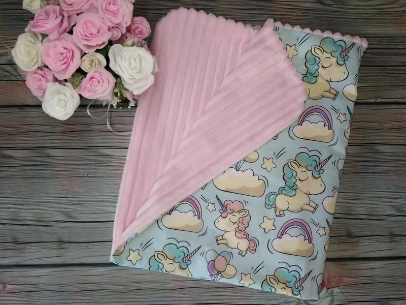 Тепленький плед з ніжного плюшу та бавовни, утеплений синтепоном. Розмір 97*77 див. Може бути ковдрою в ліжечко, в коляску, а можна скласти як конверт на виписку. Гіпоалергенна тканина, а значить не викликає роздратування, алергію та інші неприємні відчуття при контакті з шкірою малюка. Пелюшка бавовняна 80*100. В наявності є набагато більше кольорів. До плед можна замовити пеленочку, простирадло в ліжечко або коляску, подушечку і т. д. Додаткові характеристики: Стать: Унісекс Матеріал: Плюш Матеріал: Бавовна