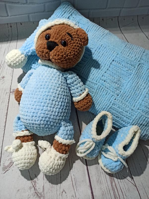 Ведмедик + плед + пінетки Ручна робота ,мега якість Пінетки 9-9.5 см Плед 85*125 см Ведмедик 40 см(висота)
