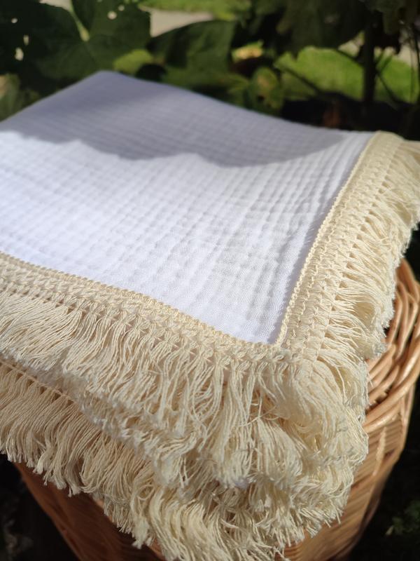 Чотирьох шаровий мусліновий пледик з бахрамою. розмір 1*1м