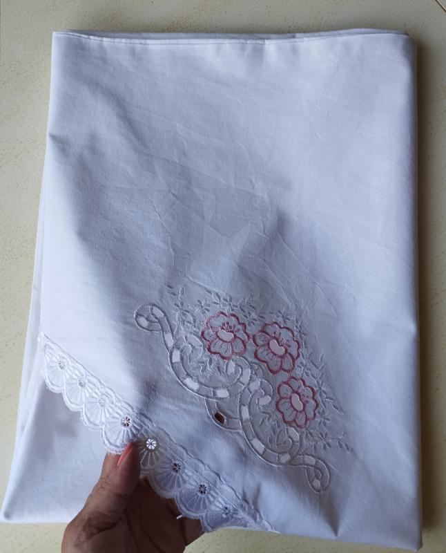 Плотный белоснежный хлопок, отверстие, как прежде, посередине ромбом отделано гаптировкой, бело-розовой вышивкой и кружевом из прошвы😍🌸👍🤍💓, отличная пододеяльник для деток размером 90х141, в использовании не была, новая😍👌👍