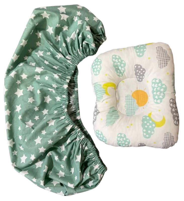 Комплект складається з 2 х предметів: - Простирадло на матрацик 80х40 призначене для всіх видів дитячих колясок. - Подушка ортопедична, призначена для підтримки шийного відділу та головки немовляти. Склад: бавовна 100%