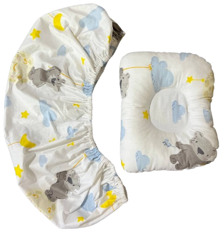 Комплект состоит из 2 х предметов: - Простынка на матрасик 80х40 предназначена для всех видов детских колясок. - Подушка ортопедическая, предназначена для поддержки шейного отдела и головки младенца. Состав: хлопок 100 %