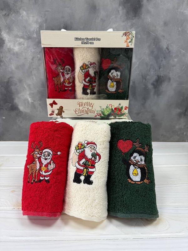 Набір рушничків з різдвяною вишивкою (3 шт) Створені для святкового настрою та тепла в домі. Упаковані стильно, готові для подарунку. Характеристики • Тканина: махра • Склад: 100% бавовна • Розмір: 30×50 см • Кількість: 3 шт • Виробник: Туреччина 🇹🇷