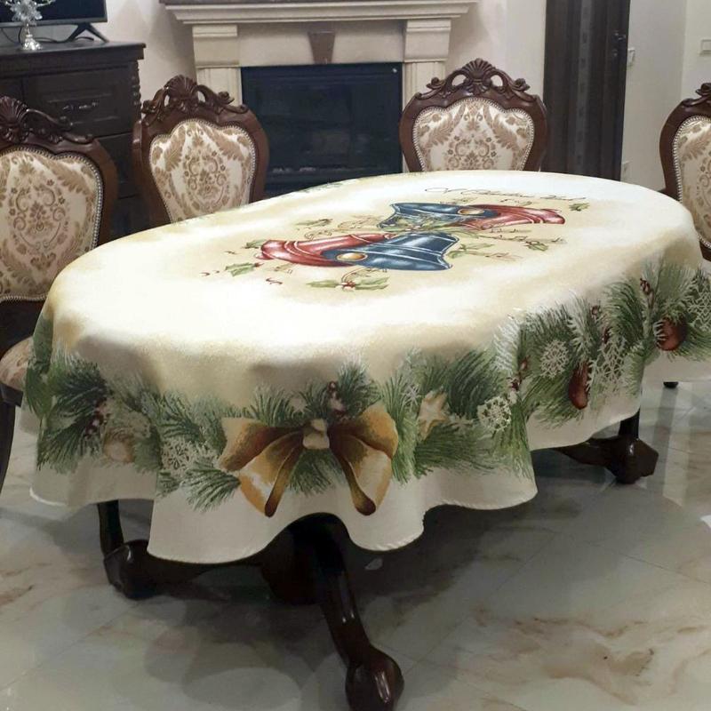 Гобеленова, дивовижно красива новорічна скатертина на овальний стіл із люрексовою ниткою безумовно прикрасить ваш стіл і створить святковий настрій! Край скатертини прикрашають пухнасті гілки ялини з новорічними кулями та великий золотистий бант! Посередині великі дзвіночки та ніжні сніжинки! Гобелен виготовляють через переплетення лляних ниток і високоякісних штучних волокон особливим способом, тому тканина виходить одночасно і тонкою, і міцною! Скатертина практична у використанні хрошо відпираються плями! Стіл прикрашений такою скатертиною створить особливу атмосферу тепла та затишку та підкреслить урочистість моменту! Склад: полікотон. Виробник: Sagol (Туреччина).