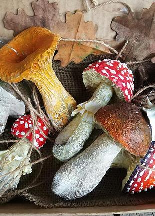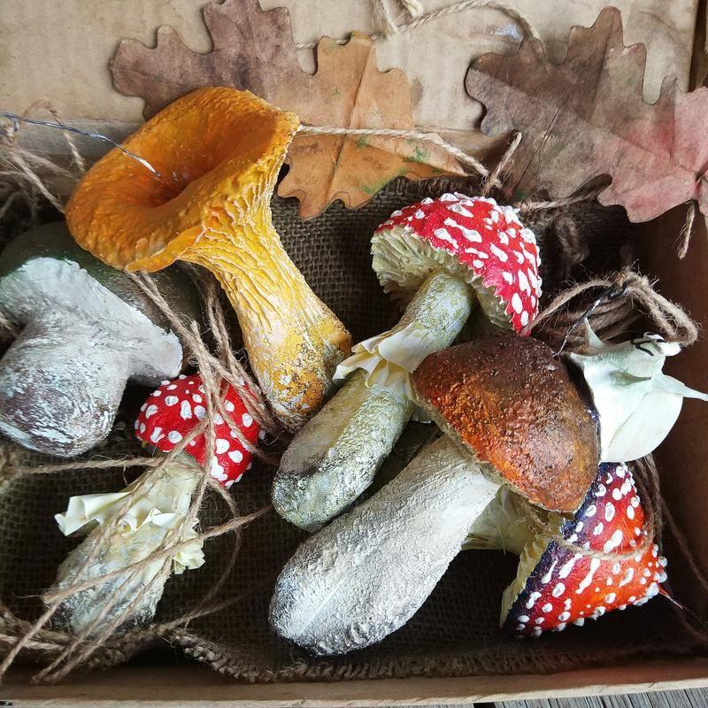 Не біда, якщо вам не вдалося потрапити до лісу цієї осені. Наша гірлянда наповнить будинок лісовим духом та чарами. Можна використовувати як новорічні ялинкові прикраси. Грибочки виконані з пап'є маше та пінопласту, розписані акриловими фарбами та вкриті екологічним воском,розмір грибочків від 9 до 20 см