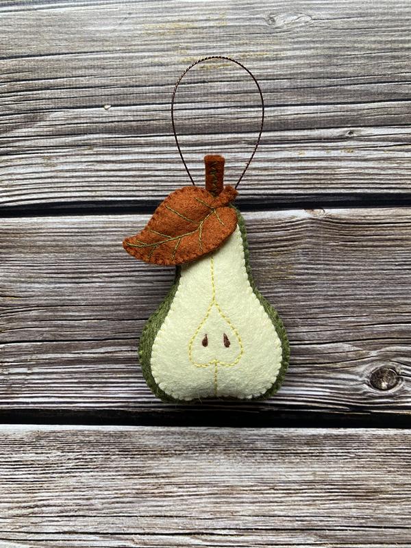Іграшка підвіс з американського ( вовна+ віскоза) фетру. Ручна робота. Вишивка з однієї сторони. Наповнювч- холлофайбер, бавовняна нитка муліне. Ширина-8 см, висота-10 см ( + » хвостик»), довжина петлі~ 6 см.. Ця апетитна груша чудово прикрасить як весняну великодню гілочку, так і новорічну ялинку. Її ефект можна подвоїти іграшкою грибом з цієї ж серії. Ніжна та грайлива, вона неодмінно додасть елегантності святковому вбранню Вашої оселі.