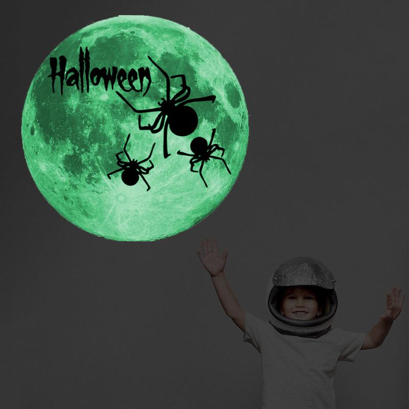 Наклейка на хелловін фосфорний місяць та павуки 30 см салатовий