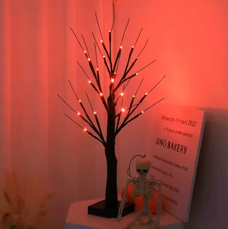 Этот светильник представляет собой стильное решение для интерьерного декора, создающее уютную и праздничную атмосферу. Идеально подходит для использования в качестве элемента освещения или сезонного украшения. Ключевые характеристики Тип освещения: 24 LED лампы (24LED warm) – обеспечивают мягкое, теплое желтое свечение, идеально подходящее для создания уюта. Дизайн: Реалистичное имитационное дерево с гибкими ветками (что позволяет регулировать форму и пышность композиции). Высота: Около 60 см (23.6 in). Данный размер идеально подходит для размещения на столе, комоде или подоконнике. Питание: Автономное на батарейках (Battery powered), обычно требует 3 батарейки типа АА (не входят в комплект). Благодаря этому дерево можно разместить где угодно без привязки к розетке. Применение Праздничный декор: Отлично подходит для создания тематической атмосферы на Хэллоуин (как на примере с пауками), Рождество или Новый год. Повседневный интерьер: Может использоваться круглый год как ночник или как элемент декора в гостиной, спальне или детской комнате, установленный в вазу или непосредственно на поверхность. Этот LED светильник сочетает естественную форму и современные технологии, добавляя теплого света в ваше пространство.