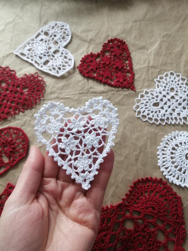 Серденька виконані гачком з 100 % бавовни, зафіксовані. Ціна за 10 штук, на другому фото видно весь набір. Розмір від 9 до 16 см.