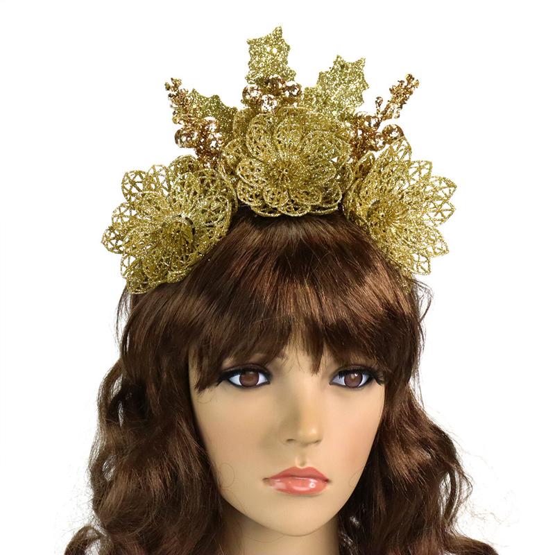Інтернет магазин Карнавал Приколів пропонує Вам купити оптом по-справжньому зимовий та стильний обідок з гілочками хвої та декоративними квітами, повністю ручної роботи. Чарівна різдвяна прикраса – ошатний аксесуар для фотосесії, корпоративу, створення унікального образу. Золоті пуансетії з хвоєю та новорічними патчами сніжинками виглядають просто чудово та дуже вишукано, а також створюють святковий настрій та ідеально впишуться у новорічні урочистості. Композиція надійно закріплена на пластиковому білому обідку універсального розміру, прикрашеному білою стрічкою репсової. Ця новорічна прикраса на голову зробить Ваше вбрання на будь-якій вечірці і буде родзинкою, як вишенька на торті.