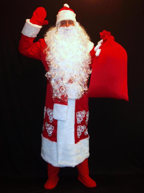 Костюм Св.Николая/Д.Мороза ФРОЛОВСКИЙ КРАСНЫЙ-7 р-р 50-56 Код 107617 Карнавальный комплект-костюм Деда Мороза «ФРОЛОВСКИЙ КРАСНЫЙ-7» отшивается в одном универсальном размере – 50-56 на рост 170-195 см В данный комплект костюма Деда Мороза ВХОДЯТ: 1. Шуба Деда Мороза на белой стеганной синтепоновой подкладке из насыщенного КРАСНОГО цвета, выполненная из прочной немнущейся полусинтетической (30% х/б +70% полиэстер) антиаллергенной ткани класса «А» итальянского производства. Шуба оторочена широкими полосами белого искусственного меха-мутона (отбеленный искусственный мех) по подолу и линии застежки (запаха), а также на рукавах. Шуба имеет роскошный эффектный шалевый воротник, изготовленный также из искусственного белоснежного меха-мутона. Застежки шубы – незаметные глазу широкие и мощные «липучки», выполненные «в потай». Шуба дополнительно декорирована аппликациями из ажурных кружевных фрагментов в форме морозных оконных узоров, расположенными на 2-х полках шубы. 2. ШАПКА Деда Мороза (ДМ-5) «МЕЛОДИЧНАЯ» С МЕХОВЫМ ПОМПОНОМ (код товара 12053)насыщенного КРАСНОГО цвета, которая изготовлена из той же ткани, что и шуба Деда Мороза. Шапка-«ЧЕТЫРЁХ-КЛИНКА» - выполнена на синтепоновой простеганной подкладке белого цвета, что позволяет сохранять изделию исходную форму и препятствует нежелательным заминаниям. Шапка оторочена широкой (высота 13 см) полосой белоснежного меха-мутона. Украшает шапку меховой помпон, выразительно контрастирующий своей белоснежностью с основным цветом костюма. Высота шапки – 26 см. 3. Широкий и очень длинный пояс-кушак ДМ-1 (код товара 12066), выполненной из основной ткани, длинной 240 см и шириной 17 см со щедрыми меховыми опушками на концах. Пояс прошит специальными армированными нитками – двойным швом, что обеспечивает его надёжность и способность выдерживать нагрузки при использовании. 4. РУКАВИЦЫ «СВЕЖИЕ» (ДМ-8), (длина – 25 см). Код товара 12082. Эти варежки Деда Мороза выполнены на синтепоновой простеганной подкладке белого или бордового цветов. Верх насыщенного КРАСНОГО цвета - из того же, основного, полусинтетического (с хлопком) эффектного материала саржево-габардинного типа (производство Италия). 5. Добротная, большая и длинная реалистичная борода «ВОЛЬНАЯ» (75 см, 190 грамм). Код 02709. 6. Популярный качественный длинный мужской реалистичный парик «БЕЛЫЙ СНЕГ». Длинна -60-65 см. Вес – 140-150 грамм. Код товара 01704. 7. Вместительный и прочный мешок для подарков «ФАРТОВЫЙ» (48х75 см). Код товара 12030. Мешок из выполненный из того же полусинтетического (с хлопком) эффектного материала саржево-габардинного типа (производство Италия) насыщенного КРАСНОГО цвета с ярко-красными завязками в тон основному цвету и с меховыми помпонами на концах этих завязок. В данный комплект костюма Деда Мороза НЕ ВХОДЯТ (можно приобрести на нашем сайте дополнительно): Посох Деда Мороза (можно выбрать любой по размеру, длине, типу верхушки, цвету и материалу изготовления, конструкции (сборный или цельный) и цене посох Деда Мороза с учётом вашего вкуса и потребностей). Сапоги или валенки Деда Мороза (можно купить дополнительно на нашем сайте) различные по технологии изготовления, материалу, высоте голенища, цене) Брюки Деда Мороза (можно выбрать по размеру, ткани, цвету). Микрофон портативный с усилителем и динамиком (при потребности в усилении голоса и при этом с сохранение