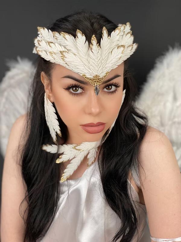Ексклюзивна біла діадема дуже складної та детальної ручної роботи з натуральним пір'ям у вигляді крил у польоті, покритих рідким пластиком, прикрашених стразами та металевими елементами. Цей головний убір доповнить будь-який костюм Білого лебедя, Білого ворона, Білого орла, Жар-птиці, райського птаха, Фенікса чи Богині. Стане чудовим доповненням до фотосесії, фестивалю чи вечірки. Розмір композиції: висота - 11 см, перо довжиною 7 см. У вартість НЕ входять додаткові аксесуари.