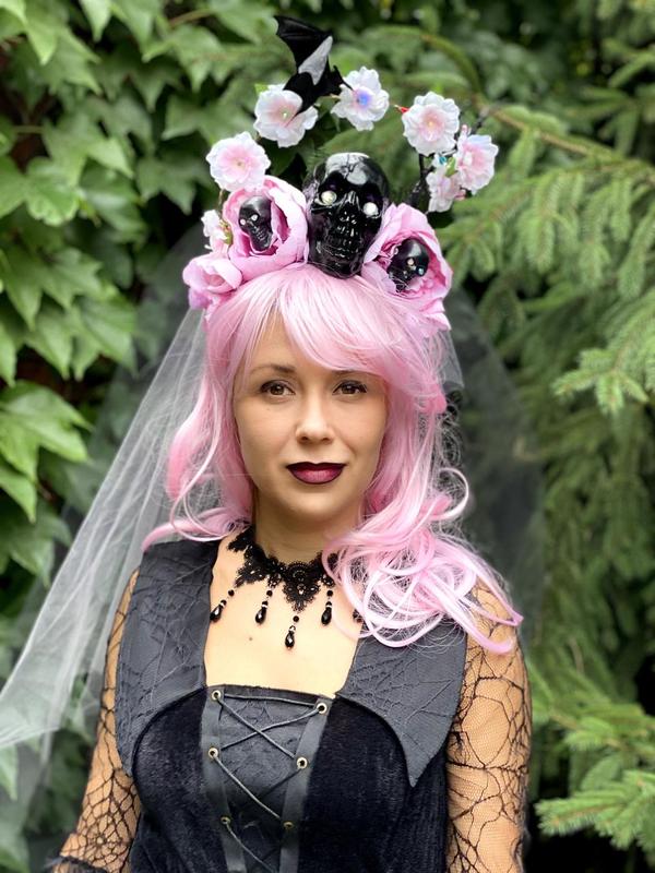 Оригинальный светящийся обруч, декорированный чёрным черепом, цветами сакуры, летучей мышью и двухцветной фатой. В серцевинке каждого цветочка находятся маленькие лампочки, которые при нажатии на кнопку регулировки освещения, в форме маленького розового сердечка, загораются разноцветными огоньками. Этот головной убор - отличное дополнение для карнавальных образов королева монстров, королева тьмы, королева загробного мира, на тематическую вечеринку Хэллоуин (Halloween). Высота композиции -- 19,5 см Длина фаты - 100 см