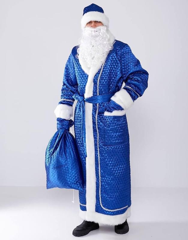 Костюм Св.Николая/Деда Мороза атласный стеганый синий р-р 44-54. Код 08455/ RZ-3011.1A1150 Ткань: атлас стеганый, с середины на подкладке В комплекте: халат, шапка, борода, перчатки, пояс, мешок Ширина 150 см Рукав 70 см Длина 152 см Размер: 44 - 54