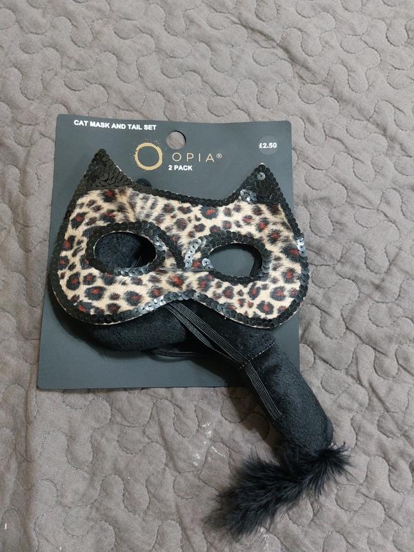 кокетливый костюм маска и хвост кошка леопард primark на резинках и хвост и маска. маска под мех в пайетках по канту хвост вельветовый, на кончике перьев новый
