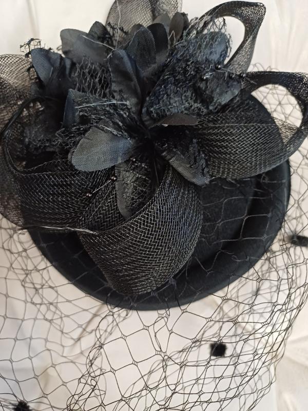 Невеличкий капелюшок-таблетка з вуаллю в ретро - стилі на заколці. Також в комплекті йде обруч.