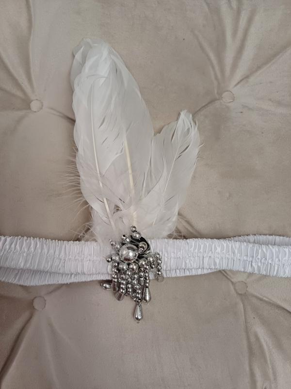 Повязка с перьями в стиле Гетсби для создания романтичного образа. Подходит для тематических вечеринок, корпоративов и фотосессий. Размер универсальный.