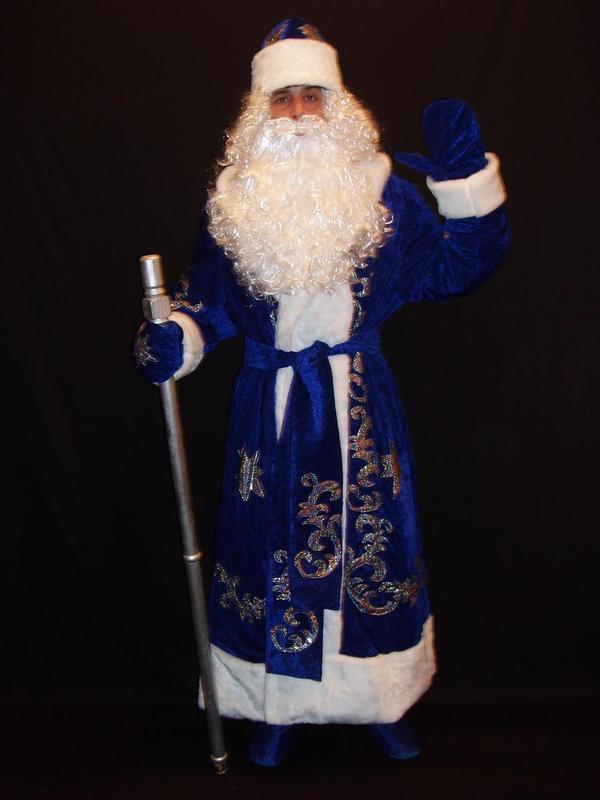 ## Костюм Св.Миколая/Д.Мороза ВЕЛИЧНИЙ СИНІЙ-3 р-р 50-54 Код 107913 В наявності розміри костюмів: 1. 50-54 (довжина: 140 см, ширина: 71см) 2. 56-60 (довжина: 145 см, ширина: 81 см) У комплект костюма входить: 1. Шуба Діда Мороза із Синього щільного оксамиту, облямована білим хутром, на підкладці, аплікаціями на полицях шуби, рукавах та спині. 2. Шапка на підкладці, із Синього щільного оксамиту, облямована хутром, з двосторонніми аплікаціями 3. Пояс із Синього щільного оксамиту з аплікаціями. 4. Рукавиці на підкладці, із Синього щільного оксамиту, облямовані хутром, з аплікаціями 5. Борода «Студена». Код 02728. Довжина – 35-37 см, вага – 70 грам . 6. Перука «Груднева». Код 01702. Вага – 120 грам У комплект костюма Діда Мороза «ВЕЛИЧНИЙ СИНІЙ-3» НЕ ВХОДЯТЬ (можна придбати на нашому сайті додатково): - Посох Діда Мороза (можна вибрати будь-який за розміром, довжиною, типом верхівки, кольором і матеріалом виготовлення, конструкції (збірний або цільний) і ціною посох Діда Мороза з урахуванням вашого смаку та потреб). - Чоботи або валянки Діда Мороза (можна купити додатково на нашому сайті) різні за технологією виготовлення, матеріалом, висотою халяви, ціною - чоботи або валянки Діда Мороза. - Штани Діда Мороза (можна купити додатково на нашому сайті). Є всі розміри штанів, на будь-який зріст. Кольори – червоний, синій, бордовий. - Мішок для подарунків (можна вибрати будь-який за розміром, тканиною, кольором і колірними відтінками, з декором і без, із зав'язками простими або зі шнуром і хутряними облямівками). - Мікрофон портативний з підсилювачем та динаміком та модератором-змінником голосу.