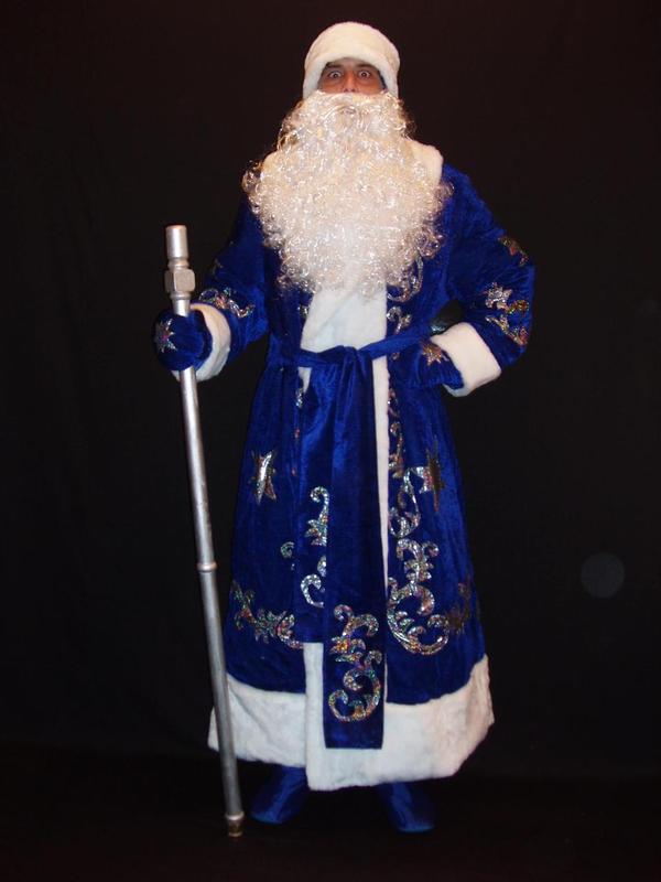 ## Костюм Св.Миколая/Д.Мороза ВЕЛИЧНИЙ СИНІЙ-2 р-р 50-54 Код 107912 В наявності розміри костюмів: 1. 50-54 (довжина: 140 см, ширина: 71см) 2. 56-60 (довжина: 145 см, ширина: 81 см) У комплект костюма входить: 1. Шуба Діда Мороза із Синього щільного оксамиту, облямована білим хутром, на підкладці, аплікаціями на полицях шуби, рукавах та спині. 2. Шапка на підкладці, із Синього щільного оксамиту, облямована хутром, з двосторонніми аплікаціями 3. Пояс із Синього щільного оксамиту з аплікаціями. 4. Рукавиці на підкладці, із Синього щільного оксамиту, облямовані хутром, з аплікаціями 5. Борода «Красавчик-Мороз». Код 02725. Довжина 37-40 см, вага – 67-70грам У комплект костюма Діда Мороза «ВЕЛИЧНИЙ СИНІЙ-2» НЕ ВХОДЯТЬ (можна придбати на нашому сайті додатково): - Перука Діда Мороза (можна вибрати будь-яку за розміром, довжиною, пишнотою, якістю волосся та ціною перуку Діда Мороза з урахуванням вашого смаку та потреб). - Посох Діда Мороза (можна вибрати будь-який за розміром, довжиною, типом верхівки, кольором і матеріалом виготовлення, конструкції (збірний або цільний) і ціною посох Діда Мороза з урахуванням вашого смаку та потреб). - Чоботи або валянки Діда Мороза (можна купити додатково на нашому сайті) різні за технологією виготовлення, матеріалом, висотою халяви, ціною - чоботи або валянки Діда Мороза. - Штани Діда Мороза (можна купити додатково на нашому сайті). Є всі розміри штанів, на будь-який зріст. Кольори – червоний, синій, бордовий. - Мішок для подарунків (можна вибрати будь-який за розміром, тканиною, кольором і колірними відтінками, з декором і без, із зав'язками простими або зі шнуром і хутряними облямівками). - Мікрофон портативний з підсилювачем та динаміком та модератором-змінником голосу.
