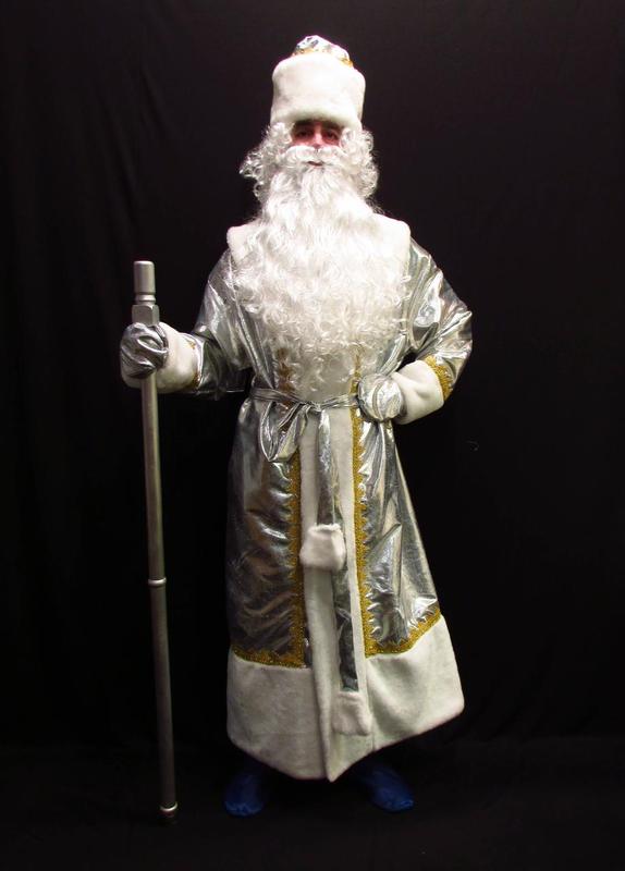 ## Костюм Св.Миколая/Д.Мороза СРІБНО-ШКІРЯНИЙ-4 р-р 50-56 . Код 107724 У постійній наявності у нас ця модель костюма є в універсальному розмірі – 50-56 на зріст 175-195 см. У комплект костюма входить: 1. Шуба на стьобаній білій підкладці із сріблястої м'якої штучної шкіри з «жатою» ефективною фактурою, що імітує натуральну шкіру. Шуба по подолу оторочена широким білим хутром-мутоном. Цим же хутром облямовані рукави та лінія запаху шуби. Додатковим декором з додатковим декором є орнаментальна ЗОЛОТИСТА блискуча тасьма на полицях шуби, вздовж хутра та вздовж хутра по лінії запаху. 2. Шапка на стьобаній білій підкладці із Сріблястої м'якої штучної шкіри з «жатою» ефективною фактурою, що імітує натуральну шкіру. Шапка оторочена білим хутром мутоном та додатково прикрашена об'ємною орнаментальною золотистою тасьмою з блиск-ефектом.Е 3. Ефектний пояс-кушак із СРІБНОЇ М'ЯКОЇ ШТУЧНОЇ ШКІРИ з «ЖАТОЮ» ЕФЕКТНОЮ ФАКТУРОЮ, що імітує натуральну шкіру, прикрашений хутряними облямівками на кінцях. 4. Рукавиці на білій підкладці, зі сріблястої м'якої штучної шкіри з «жатою» ефективною фактурою, що імітує натуральну шкіру. 5. Реалістична велика борода "ЗНАТНА" (55 см, 125 гр.) Код 02716. 6. Реалістична кучерява перука «ГРУДНЕВА». Код 01702. Вага – 120 грам У комплект костюма «СРІБНО-ШКІРЯНИЙ-4» НЕ ВХОДЯТЬ (можна придбати на нашому сайті додатково): - Посох (можна вибрати будь-який за розміром, довжиною, типом верхівки, кольором та матеріалом виготовлення, конструкції (збірний або цільний) та ціною посох а з урахуванням вашого смаку та потреб). - Чоботи або валянки (можна купити додатково на нашому сайті) різні за технологією виготовлення, матеріалом, висотою халяви, ціною - чоботи або валянки. - Мішок для подарунків (можна вибрати будь-який за розміром, тканиною, кольором і колірними відтінками, з декором і без, із зав'язками простими або зі шнуром і хутряними облямівками). - Мікрофон портативний з підсилювачем та динаміком