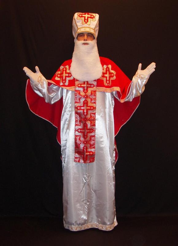 ## Костюм-комплект Святого Миколая - ЖИТОМИРСЬКИЙ-3 р-р 50-56. Код 230043 Костюм-комплект Святого Миколая - ЖИТОМИРСЬКИЙ-3 відшивається в одному універсальному розмірі - 50-56 на зріст 175-190 см У комплект костюма Святого Миколая «ЖИТОМИРСЬКИЙ-3» входять: 1. Нижнє довге вбрання Святого Миколая з білого блискучого атласу або напівсинтетичної саржі-габардину, облямована широкою біло-золотистою тасьмою по подолу та рукавам. 2. Верхнє парадно-святкове вбрання Святого Миколая з напівсинтетичної саржі-габардину ЧЕРВОНОГО кольору, облямоване широкою біло-золотистою тасьмою по краю та коміру і багато прикрашене вишитими хрестами (аплікації) і доповнене ошатною ризою червоного кольору з вишитими сріблястими хрестами і символікою християнської тематики. 3. Шапка-мітра Святого Миколая на щільній корсажно-повстяній підкладці, верх - із напівсинтетичної саржі-габардину БІЛОГО кольору. Мітра прикрашена широкою біло-золотистою тасьмою по нижньому краю, тасьмою-кіскою золотистого кольору по ребрах мітри, а також доповнена хрестом (аплікація), вишитим срібними нитками. 4. Білі нейлонові рукавички стрейчевого типу Код 12005. 5. Хутряна велика борода «Окладиста». Код 02727. Довжина – 44 см, ширина – 30 см. 6. Реалістична кучерява перука «Груднева». Код 01702. Вага – 120 грам У комплект костюма Святого Миколая «ЖИТОМИРСЬКИЙ-3» НЕ ВХОДЯТЬ (можна придбати на нашому сайті додатково): - Посох Святого Миколая (можна вибрати за розміром, довжиною, типом верхівки, кольором і матеріалом виготовлення, конструкції (збірний або цільний) і ціною посох Святого Миколая з урахуванням вашого смаку та потреб). - Чоботи або валянки Святого Миколая (можна купити додатково на нашому сайті різне взуття за технологією виготовлення, матеріалом, висотою халяви, ціною) - Штани Святого Миколая (можна вибрати за розміром, тканиною, кольором). - Мішок для подарунків Святого Миколая (можна вибрати будь-який за розміром, тканиною, кольором та кольоровими відтінками, з декором і без, із зав'язками простими або зі шнуром або хутряними облямівками). - Мікрофон портативний з підсилювачем та динаміком